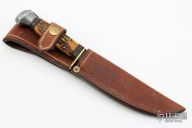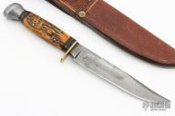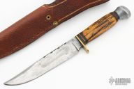 This antique hunter by Olsen Knife Co features a false top edge, fileworked spine and fullers, .174" blade stock and 1.042" blade depth, hidden tang construction. The handle has a brass guard, aluminum butt, stag grip. Comes with a custom brown leather sheath. Has patina, has been resharpened, has scratches and small dings, otherwise good condition for its age.