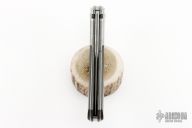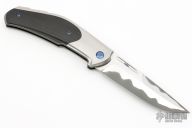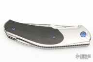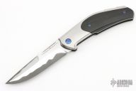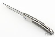 This lockback by Nylund Knives features a San Mai Damascus blade (forged by the maker) with fullers and false top edge. The handle has a satin finished  stainless steel scales with carbon fiber inlays, fileworked zirconium liners, mirror polished stainless steel lockbar/backspacer. Nice lockup and blade seating. Has a few light scratches, otherwise excellent condition.