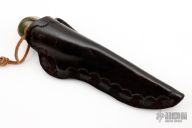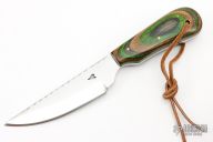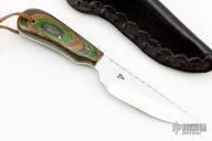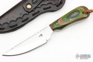 This knife by Vosler Knives features a mirror polished blade with fileworked spine, .133" blade stock and 1.146" blade depth, full tang construction. The handle has dymondwood scales with brass pins and lanyard hole. Comes with a hand tooled black leather sheath. Has a couple light scratches, otherwise excellent condition.
