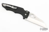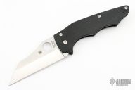 This Yojumbo by Spyderco features a satin finished wharncliffe blade with thumbhole. The handle has a black G-10 frame with stainless steel liners, lock is on the spine of handle. 4-way reversible stainless steel clip. Nice detent, lockup and blade seating. Excellent condition. Comes with original box.