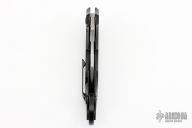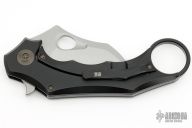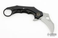 This folding karambit by WE Knife Company features a stonewashed hawkbill blade with thumbhole and notched thumbrest and flipper. The handle has a milled black titanium frame with matching tip up clip and backspacer with finger hole. Rides on bearings. Comes with nylon zippered case and box. Excellent condition.