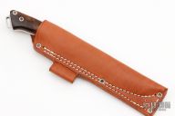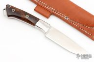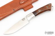 This Fox River fixed blade from Bark River Knives features a satin finish drop point blade with .168" blade stock and 1.074" blade depth. The handle has mirror polished stainless steel bolsters, Ironwood scales with red liners over full tang construction. Mosaic pins. Lanyard bail on pommel. Includes leather sheath and original box. Excellent condition.