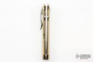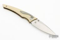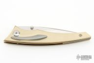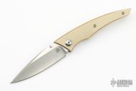 Blurring the lines between a tactical folder and an art knife, The Chisel, designed by Jeremy Marsh is not meant to be everyone’s everyday carry. The knife is a visual smorgasbord of sweeping lines, dramatic contours, and a bit of his uniquely aggressive flair… All of which are unmistakably Marsh. What sets this model apart further is the tip down carry, paying homage to the original Chisel design. A truly epic design with a lot of swagger. This model features a polished bronze liner with shadowboxed Ivory Paper Micarta scales from Greg Hansen. Comes with original box and zipper case. Has some light scuffs and scratches, great condition otherwise.