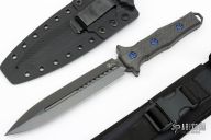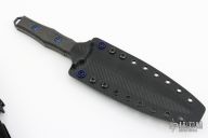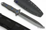 This Nephilim by Heretic Knives features a double-edged and DLC Black blade, .201" blade stock and 1.167" blade depth, full tang construction. The handle has carbon fiber scales with blue hardware, lanyard hole at the butt. Comes with a kydex sheath, original box and a nylon sheath. Excellent condition. S/N 00983