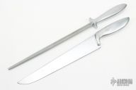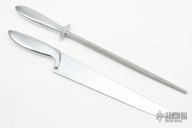 This vintage carving set by Gerber features a carving knife and knife steel for sharpening. The blade is satin polished with .094" blade stock and 1.779" blade depth, hidden tang construction with a cast handle. Comes with matching knife steel. Both have some light scratches, otherwise good condition for their age.