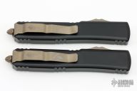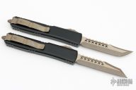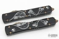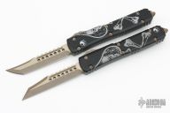These two Ultratech OTF automatics by Microtech both feature bronzed stonewashed blades. Death Card stylized aluminum contoured frame with apocalyptic finished hardware and tip down stainless steel clip.  One knife has a Hellhound blade and one knife has a Warhound blade.  Includes original box and papers.  New condition.