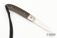 This Loveless City Knife has a satin finished drop point blade with nail nick. Handle is micara with stainless steel bolsters, liners, spring and lanyard hole. Comes with original sheath. Has some light scratches, otherwise good condition.