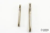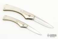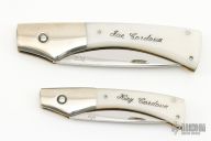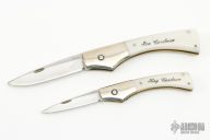 These slipjoints by Bob Ogg were made for knife maker Joe Cordova and his wife Kay Cordova. They feature mirror polished blades with nail nicks. The handle has dovetailed nickel silver bolsters, white corian covers, brass liners, steel backspacer. Has some light scratches, otherwise good condition.