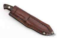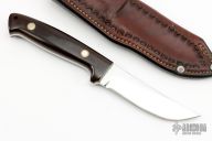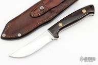 This Hunter by John LeBlanc features a mirror polished blade with .192" blade stock and 1.015" blade depth, full tapered tang construction. The handle has maroon linen micarta scales with brass liners. Comes with a hand tooled brown leather sheath. Has a few light scratches, otherwise excellent condition. Comes with a zippered case.