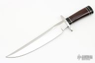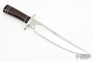 This Bowie by Kermit Laurent features a mirror finished blade with false top edge, .281" blade stock and 1.640" blade depth, hidden tang construction. The handle has a stainless steel guard, cocogolo grip, black paper micarta and nickel silver spacers. Comes with a zippered case. Excellent condition.