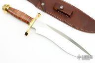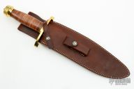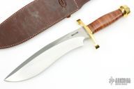 This Sasquatch by Randall Made Knives features a satin finished recurve blade with sharpened top edge, .324" blade stock and 2.342" blade depth, hidden tang construction. The handle has a bugged brass guard and butt, stacked leather grip with black spacers. Comes with a brown leather sheath and zippered case. #940 on the blade. Excellent condition.