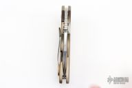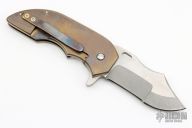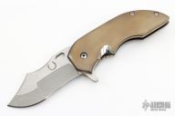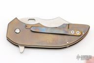 This War Pig from Red Horse Knife Works features a two-tone compound ground clip point blade. The blade has a swedge, notched thumb rest, thumb hole and flipper. The handle is comprised of a orange peeled and bronzed titanium frame over barrel spacers with a matching tip up clip. Excellent condition.