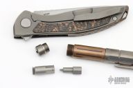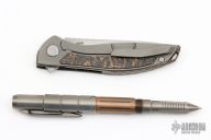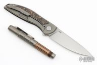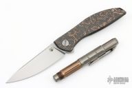 This HatiOn Zero by Shirogorov Knives features a tumble finished drop point blade with flipper. The handle is comprised of a copper carbon fiber and a tumbled titanium lockside with a copper carbon fiber inlay, a copper backspacer with recessed lanyard bail. 3D Machined titanium pocket clip is positioned for right hand, tip up carry. Comes with original Cova Design leather pouch, V3 Tool Pen with copper body and COA. Rides on MRBS. Excellent condition.