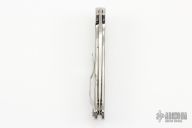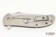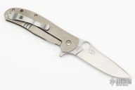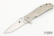 This C214TIP Advocate is a Gayle Bradley design executed by Spyderco. It features a satin finished drop point blade with thumbhole, notched thumb ramp and flipper. The handle has an orange peeled titanium frame over barrel spacers with a steel tip up clip that is reversible for right or left hand carry. Steel lock face insert and lanyard hole in pommel. Nice detent, lockup and blade seating. Rides on bearings. Excellent condition. Comes with original box and papers.