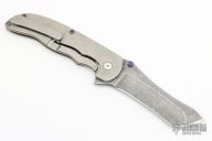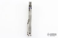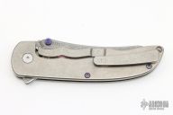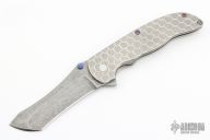 This Norseman (#1171) by John Grimsmo features a tumbled blade with dual anodized titanium thumbstuds, notched thumb ramp and flipper. Stonewashed titanium frame with a reverse honeycomb pattern front scale and anodized titanium screws. Very smooth action that requires no wrist movement. Nice detent, lockup and blade seating. Rides on ceramic bearings. Knife is in excellent condition, shows no signs of use or carry. Comes with original hard case and COA dated May 22, 2018.