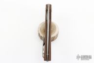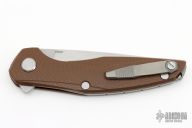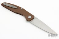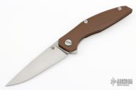 This model 111 flipper by Shirogorov Knives has a flat ground blade with flipper. Handle is contoured/textured brown G-10 with a titanium tip up clip and backspacer, stainless steel single liner. Dead center blade seating, excellent detent and lockup, and flips superbly. Comes with original box and COA. Knife is in excellent condition.