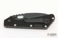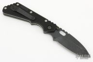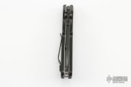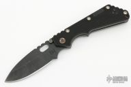 This is a Buck made Strider SNG with black coated blade and black scales, stainless steel liners, black coated stainless steel tip up reversible carry clip. Notched thumbrest area and front/rear of handle provide a solid grip. Has some scuffs, otherwise good condition.