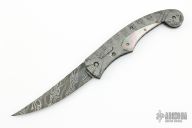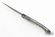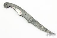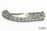 This custom automatic features a damascus blade and damascus frame with black lip pearl scales. Matching black lip pearl inlays in backspacer. Extensive file work on frame, blade spine, backspacer, push button, interior, and liners. Leaf spring. Beautiful materials. Has a couple light scuffs, excellent condition otherwise.