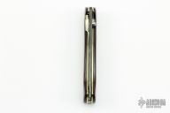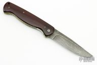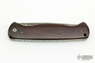 This D/A Auto by Thomas Vallotton features a Damascus drop point blade with single knurled thumbstud. The handle has burgundy micarta scales, jeweled and anodized titanium liners and stainless steel backspacer. Nice action, lockup and blade seating. Has some scratches and patina on the blade. Great conditon otherwise.