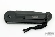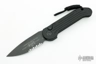This LUDT side opening automatic by Microtech has a black blade with a partially serrated edge and a black aluminum frame. This tactical version has black fittings. Stainless steel clip. Dated 11/2022 and serial number 28574. Comes with original box and sheath. Excellent Condition.