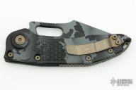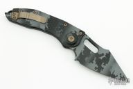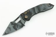 This Stitch Auto by Microtech Knives features an urban camo coated blade and false top edge, notched thumb and finger rests. The handle has an urban camo coated and milled aluminum handle with a titanium backspacer, stainless steel hardware and clip, tip up carry, lanyard hole at the butt. Comes with original box and papers. S/N of 227 and dated 02/2023. New condition.