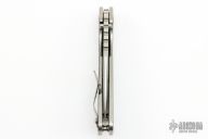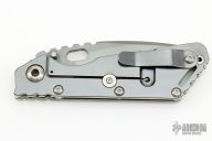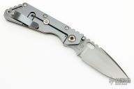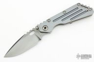 This Mick Strider Performance Series SMF framelock folder features a black satin spear point blade with thumbhole and notched thumbrest. The handle has a black satin titanium frame with titanium clip, tip up carry. Jimping on blade spine. Includes Hinderer "Lock Bar Stabilizer" for maximum reverse lock retention. Nice detent, lockup and blade seating. New condition.