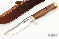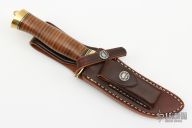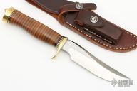 This Model 3-5 by Randall Made Knives has a satin finished blade with false top edge, .220" blade stock and 1.145" blade depth, hidden tang construction. The handle has a brass guard and butt, stacked leather grip and black/brass spacers. Comes with a brown leather sheath and original paper wrapping. New from maker.