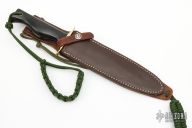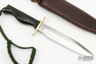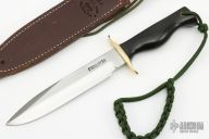 This Model 16 Special Fighter from Randall Made Knives has a satin finished stainless steel spear point blade with sharpened top edge, .215" blade stock and 1.248" blade depth, full tang construction. Handle has a nickel silver double guard, black linen micarta "impregnated" border patrol style grip. Stainless steel blade. Comes with waxed brown leather sheath. Has a couple light scratches, otherwise excellent condition.
