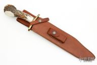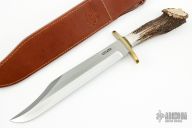 This Model 12-11 Confederate Bowie by Randall Made Knives features a satin finished carbon steel blade with sharpened top edge, .193" blade stock and 1.763" blade depth, hidden tang construction. The handle has a brass guard, crown stag grip with black/brass spacers. Comes with a brown leather sheath and a Randall zippered case. Excellent Condition.