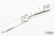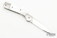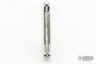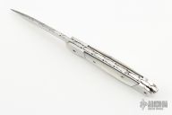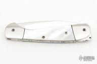 This knife features a mirror polished blade with fileworked spine. The handle has titanium bolsters, mother-of-pearl scales, fileworked titanium liners, fileworked stainless steel backspacer. Nice detent, lockup, action and blade seating. Released by pushing the tail of the scale towards the blade, and unlocked the same way. Has scuffs and scratches, great condition otherwise. Previously sold as "Custom Automatic Osborne".
