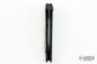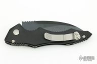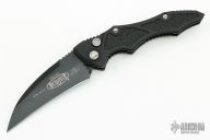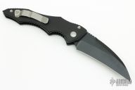 This Kestrel Auto from Microtech has a black coated 154-CM stainless steel hawk-bill plain edge blade. Handle is black aluminum with non-slip inserts, stainless steel tip up clip, and blue standoffs. Dated 01/2011 and s/n 00147. Excellent condition.