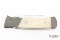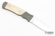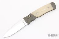 This Automatic by Z Custom Knives features a mirror polished drop point blade with file worked thumbrest. The handle is comprised of a bead blasted titanium frame with bone inlays and inlaid push button over a fileworked stainless steel backspacer. Has some scuffs, otherwise excellent condition. Hard to find!