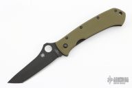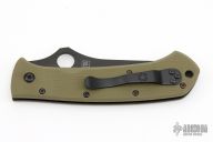 This Bob Lum designed folding knife by Spyderco features a black tanto style blade marked with the Lum Logo. Stainless steel liners. Textured green G-10 scales, tip up stainless steel clip. Comes with original box and papers. Nice detent, lockup and blade seating. New condition.