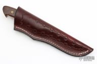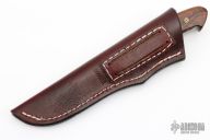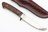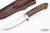 This knife by JT Downie features a hand rub satin finished blade with .124" blade stock and .935" blade depth, full tapered tang construction. The handle has a stainless steel guard with walnut scales and mosaic pins, red liners. Comes with a hand tooled brown leather sheath. Has a few light scratches, otherwise excellent condition.