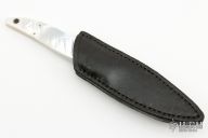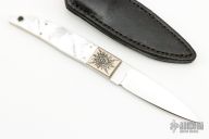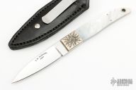 This fixed blade from T.W. Downing features a mirror polished drop point blade, .111" blade stock and .784" blade depth, full tapered tang construction. The handle has engraved nickel silver bolsters with mother of pearl scales. Lanyard tube in pommel. Includes a black leather sheath with boot clip. Excellent condition.