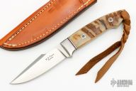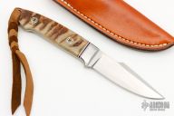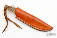 This beautiful sheath knife from Mr. Pease features a hand rub satin finished blade with .143" blade stock and .868" blade depth, full tapered tang construction. The handle has stainless steel bolsters, mosaic pins, sheep horn scales and red/white/black spacers. Comes with a brown leather dangle sheath. Excellent condition. "Swm140" on the blade.