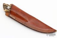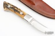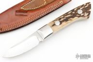 This hunter by Herman Schneider features a hand rubbed satin finish blade with .183" blade stock, .945" blade depth, full tapered tang construction. The handle has stainless steel dovetailed bolsters and stag scales. Great feel in hand. Outstanding work. Comes with a brown leather sheath. Has some light scratches, could use a light resharpening, otherwise good condition.