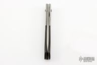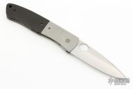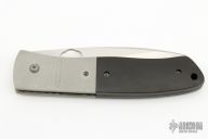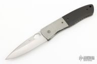 This knife by Mel Pardue features a hand rub satin finished drop point blade with thumbhole. The handle has bead blasted aluminum bolsters, black paper micarta scales, bead blasted titanium liners, black linen micarta backspacer. Has some scuffs/scratches, otherwise good condition.
