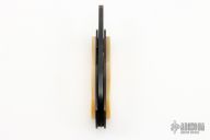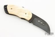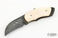 This Baby Bear Claw Linerlock by Loyd McConnell features a black blade with a friction folder style opening. The handle has gold lip pearl scales, black titanium liners and a darkened steel backspacer. Nice detent, lockup and blade seating. Excellent condition. Comes with a brown leather belt sheath.