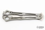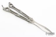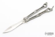 This Spyderfly Balisong by Spyderco features a satin finished spear point blade with a false top edge. The handles are bead blasted stainless steel with a tip up clip (4-way reversible). Has some scuffs/scratches, otherwise good condition.