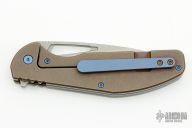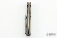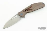 This framelock flipper by Fanatic Edge features a tumbled blade with flipper. The handle has an anodzied titanium frame with matching tip up clip and backspacer, anodized titanium hardware. Rides on bearings, nice detent, and lockup. Excellent condition. Comes with a cloth pouch.