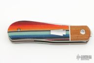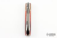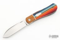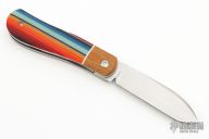 This Dogleg Front Flipper by Enrique Pena features a hand rub satin finished drop point blade with a notched thumbrest and front flipper. The handle has natural canvas micarta bolsters, canvas micarta scales over white liners, titanium liners, brown canvas micarta backspacer.  Stainless steel shield. Includes padded zippered case. New from maker at the 2023 Blade Show Texas.