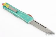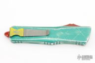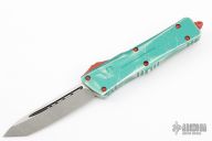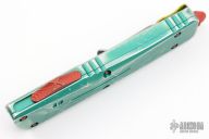 This Combat Troodon Bounty Hunter by Microtech Knives features a tanto blade with fullers, satin flats and apocalyptic finished grinds. The handle has a green battle worn aluminum handle with red hardware, tip down apocalyptic finished stainless steel clip. Excellent condition. Dated 11/2020 s/n 1072.