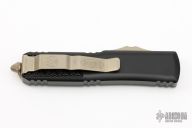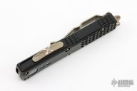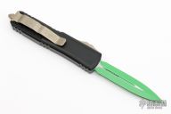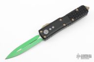 This UTX-85 OTF Automatic from Microtech features a green cerakoted double-edged blade with fuller. The handle has a black aluminum tri grip frame with bronzed steel thumb slide, clip and glass breaker. Dated 07/2022 with a S/N of 5980. Excellent condition.
