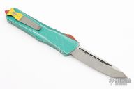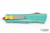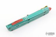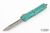 This Combat Troodon Bounty Hunter by Microtech Knives features a tanto blade with fullers, satin flats and apocalyptic finished grinds. The handle has a green battle worn aluminum handle with red hardware, tip down apocalyptic finished stainless steel clip. Excellent condition. Dated 11/2020 s/n 1162.
