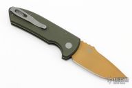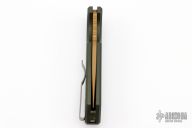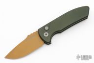 The Protech Knives SBR (Short Bladed Rockeye) is a utilitarian, compact, every-day-carry version of the Les George iconic Rockeye model, retaining the classic design in a smaller package. The SBR has the same American innovations as the Rockeye, featuring modern materials, high tech manufacturing, advanced coil spring mechanism, and quality American production. This version of the SBR has a bronze coated blade, green anodized aluminum handles and bead blasted hardware. Has a couple scuffs, otherwise excellent condition.