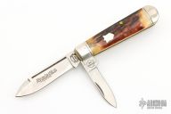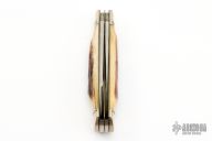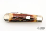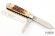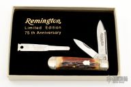This 75th Anniversary Jack Knife by Remmington has two satin finished blades with nail nicks. The handle has nickel silver bolsters, stag covers, brass liners and steel springs.  Includes the original box and papers. #1365 of 7500. EHas some light scratches and patina, otherwise excellent condition.
