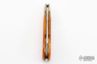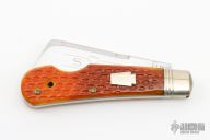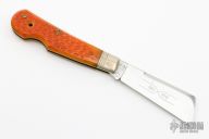 This Cotton Sampler by Schatt & Morgan features a mirror finished blade. The handle has nickel silver fluted bolsters, orange jigged bone covers, brass liners and stainless steel spring. Excellent condition. Comes with original box.