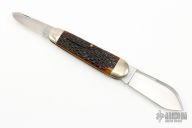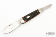 This Wildcatter Knife by Schatt & Morgan features 2 mirror polished blades with nail nicks. The handle has nickel silver bolsters, front and rear, amber wormgroove bone covers with a nickel silver escutcheon, brass liners and stainless steel springs. Has a few light scratches, otherwise excellent condition. Comes with original box.