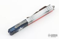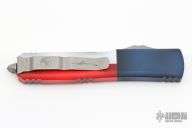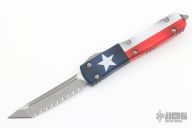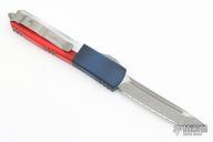 This Ultratech OTF automatic by Microtech features an Apocalyptic finished tanto blade with a fully serrated edge and satin finished flats. Red, white and blue aluminum contoured frame with a tip down stainless steel clip. Dated 03/2023. Serial Number 080.  New from maker at the 2023 Blade Show Texas